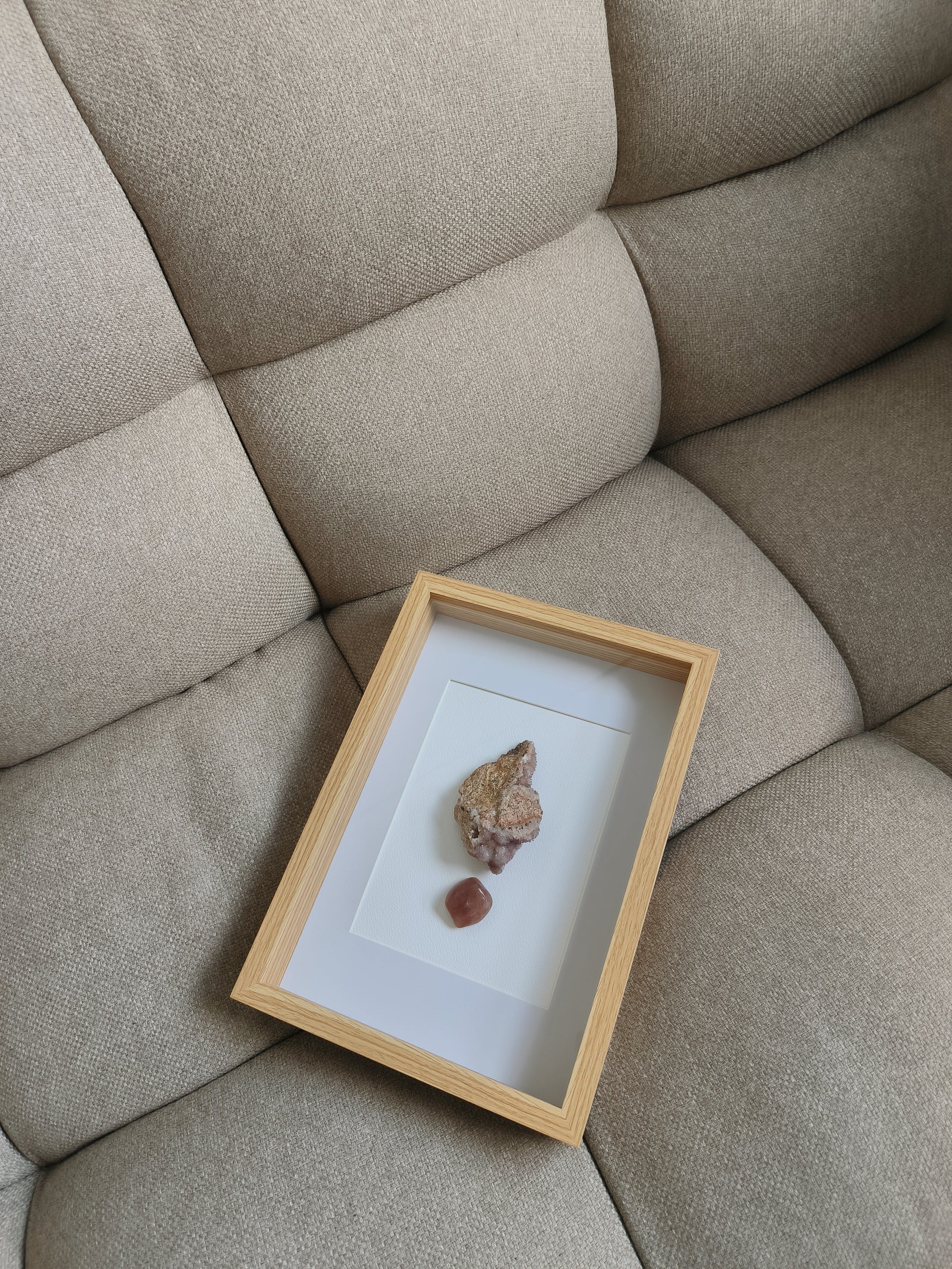 Beschrijving: Grid van kristallen op een ondergrond van canvas. In een lijst van hout.